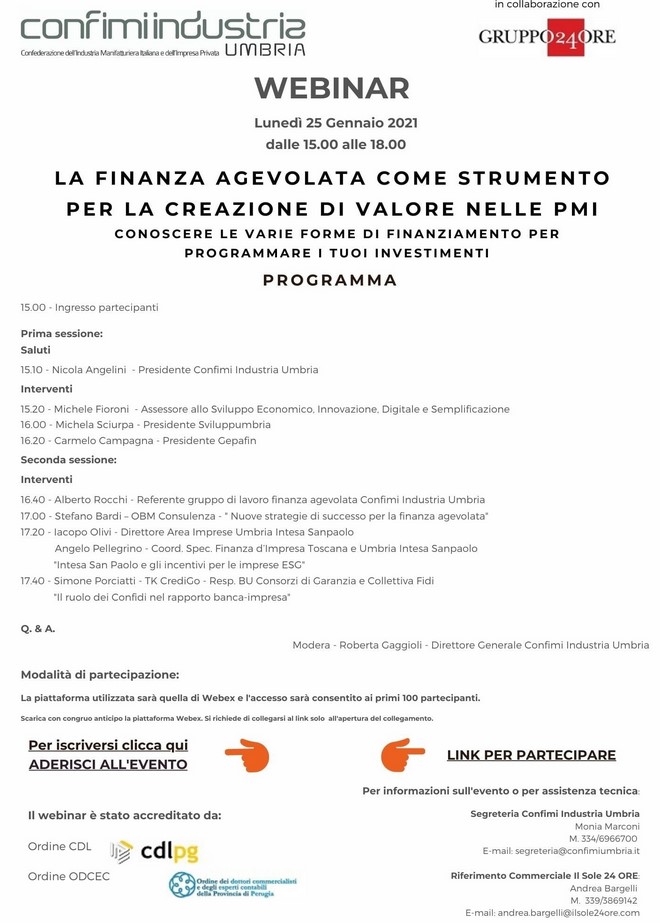 Il Webinar organizzato da Confimi Impresa Umbria dedicato a "LA FINANZA AGEVOLATA COME STRUMENTO PER LA CREAZIONE DI VALORE NELLE PMI" è stato l'occasione per fare il punto sugli strumenti di finanziamento disponibili per le imprese.