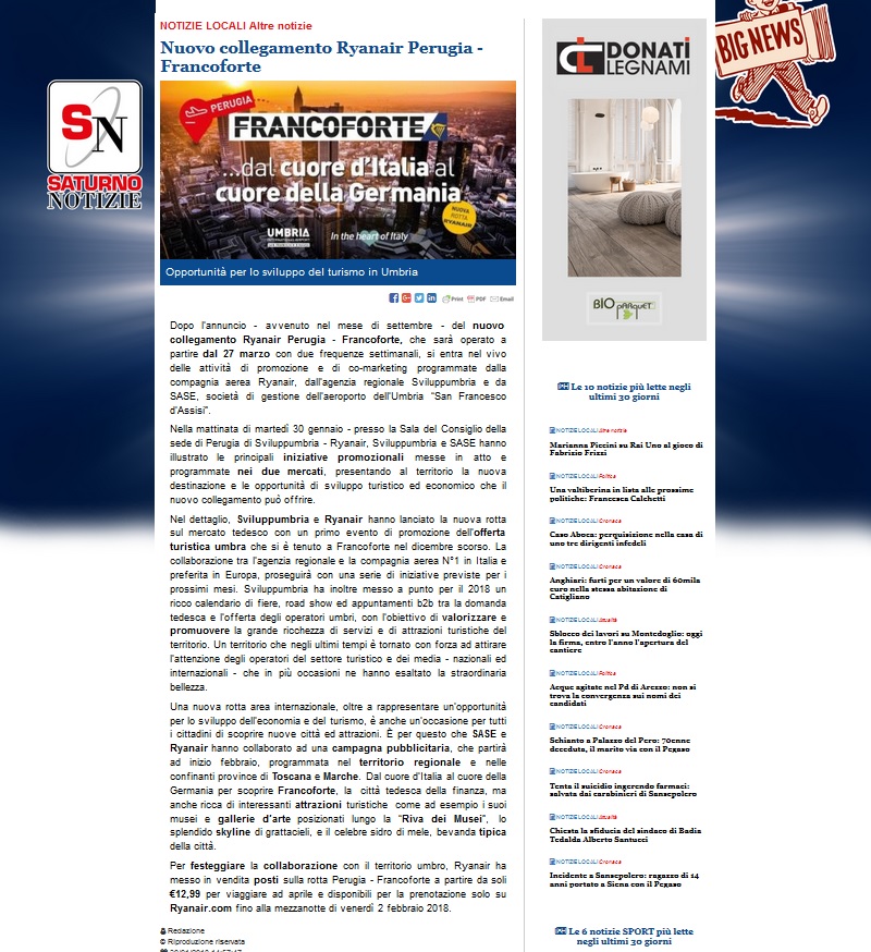 Dopo l’annuncio - avvenuto nel mese di settembre - del nuovo collegamento Ryanair Perugia - Francoforte, che sarà operato a partire dal 27 marzo con due frequenze settimanali, si entra nel vivo delle attività di promozione e di co-marketing programmate dalla compagnia aerea Ryanair, dall’agenzia regionale Sviluppumbria e da SASE, società di gestione dell’aeroporto dell’Umbria “San Francesco d’Assisi”.