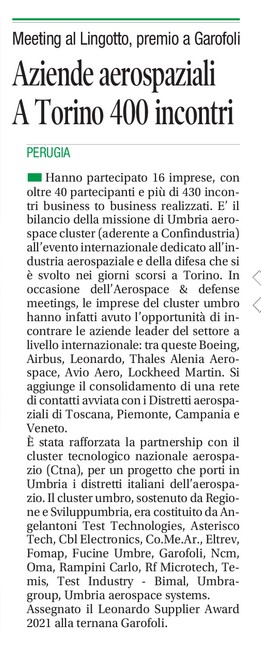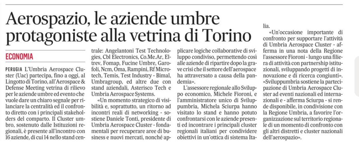 Presenza importante di Umbria Aerospace Cluster (UAC) al Lingotto di Torino per l’Aerospace & Defense Meeting, dal 30 novembre al 2 dicembre, vetrina di rilievo per le aziende umbre ed evento che vuole dare un chiaro segnale per rilanciare la centralità ed il confronto diretto con i principali stakeholders del comparto. Il Cluster umbro, sostenuto dalle Istituzioni regionali, è presente all’incontro con 16 aziende, di cui 14 nello stand centrale: Angelantoni Test Technologies, Cbl Electronics, Co.Me.Ar, Eltrev, Fomap, Fucine Umbre, Garofoli, Ncm, Oma, Rampini, Rf Microtech, Temis, Test Industry - Bimal, Umbragroup, ed altre 2 con stand aziendali, Asterisco Tech e Umbria Aerospace Systems.