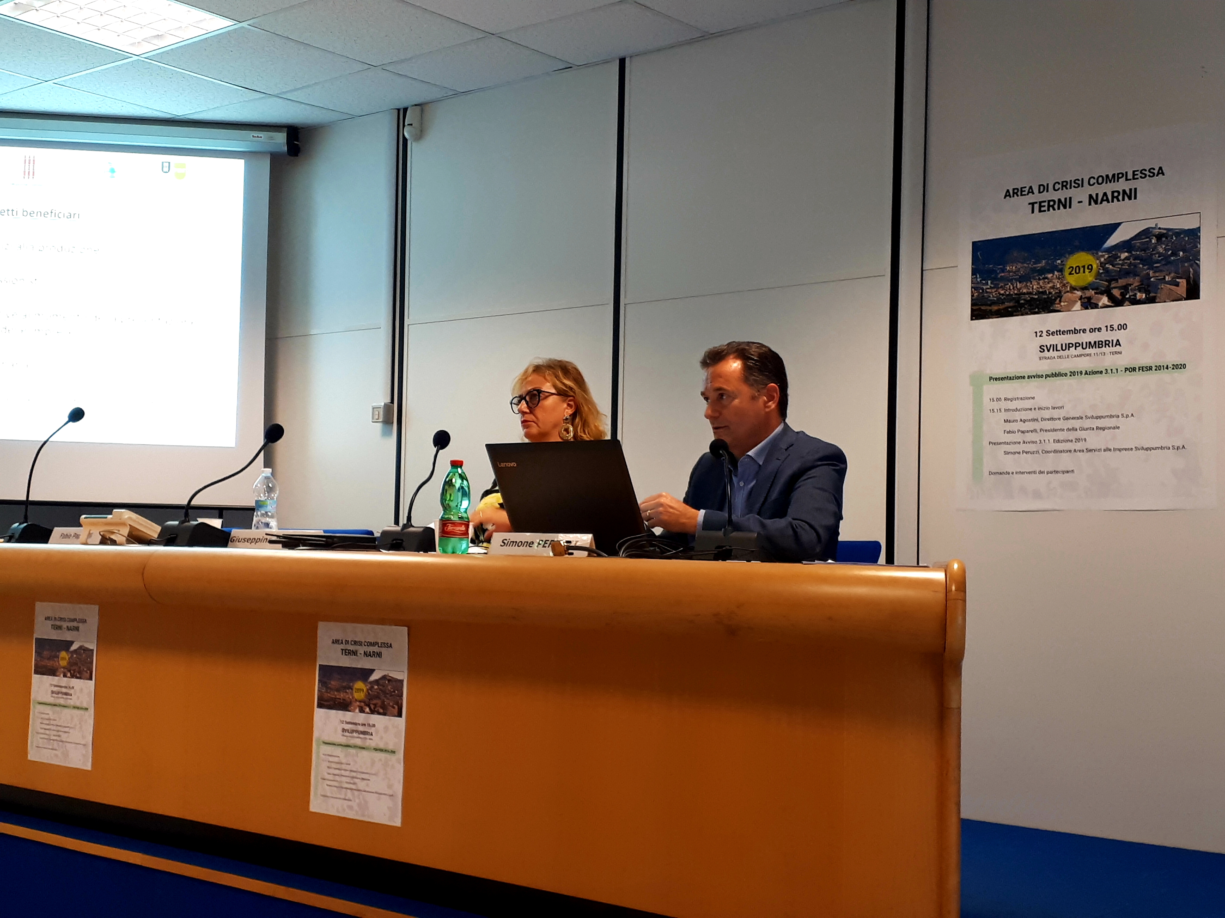Nell’ambito delle attività previste dall’Area di crisi complessa Terni-Narni si è tenuta presso Sviluppumbria- sede di Terni – la presentazione dell’Avviso pubblico – Edizione 2019 – Azione 3.1.1 POR FESR 2014-2020 a supporto dei programmi di investimento da realizzare in uno dei 17 Comuni umbri ricompresi nell’Area di Crisi Complessa: Acquasparta, Amelia, Arrone, Avigliano Umbro, Calvi Dell'Umbria, Ferentillo, Giove, Lugnano in Teverina, Montecastrilli, Montefranco, Narni, Otricoli, Penna in Teverina, Polino, San Gemini, Stroncone, Terni.