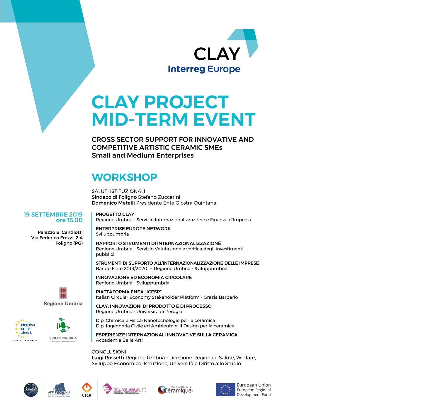 Si terrà 19 settembre 2019 alle ore 15,00 a Palazzo Candiotti di Foligno ( Via Federico Frezzi, 2-4) il mid-term event del Progetto Clay Interreg-Europe di cui è capofila la Regione Umbria. Sarà l'occasione per approfondire le tematiche di innovazione prodotto/processo, design e nanotecnologie per la ceramica. Sviluppumbria presenterà gli strumenti per l'Internazionalizzazione dell'imprese offerti dal progetto europeo EEN e del Bando Fiere - POR FESR . Saranno inoltre illustrati anche casi di studio legati all'economia circolare.