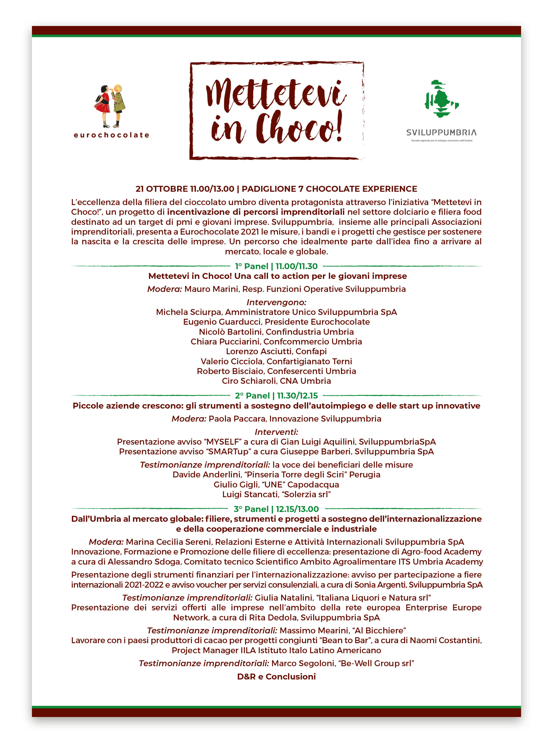 Nel corso del primo, dal titolo “Mettetevi in Choco! Una call to action per le giovani imprese”, moderato da Mauro Marini, Responsabile Funzioni Operative di Sviluppumbria, sono intervenuti Michela Sciurpa, Amministratore Unico di Sviluppumbria, Eugenio Guarducci, Presidente di Eurochocolate, Nicolò Bartolini di Confindustria Umbria, Chiara Pucciarini di Confcommercio Umbria, Lorenzo Asciutti di Confapi, Valerio Cicciola di Confartigianato Terni, Roberto Bisciaio di Confesercenti Umbria e Ciro Schiaroli di Cna Umbria.