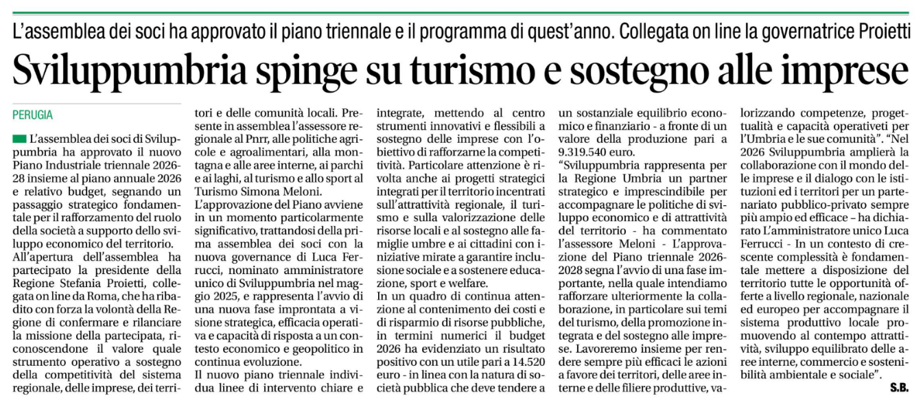 “Sviluppumbria rappresenta per la Regione Umbria un partner strategico e imprescindibile per accompagnare le politiche di sviluppo economico e di attrattività del territorio- ha commentato l’Assessore Meloni- L’approvazione del Piano triennale 2026-2028 segna l’avvio di una fase importante, nella quale intendiamo rafforzare ulteriormente la collaborazione, in particolare sui temi del turismo, della promozione integrata e del sostegno alle imprese. Lavoreremo insieme per rendere sempre più efficaci le azioni a favore dei territori, delle aree interne e delle filiere produttive, valorizzando competenze, progettualità e capacità operative. Una sinergia solida tra Regione e Sviluppumbria è la chiave per tradurre la visione strategica in risultati concreti per l’Umbria e le sue comunità”