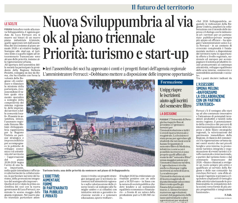 “Nel 2026 Sviluppumbria, seguendo le indicazioni della Regione Umbria, amplierà la collaborazione con il mondo delle imprese e il dialogo con le istituzioni ed i territori per un partenariato pubblico-privato sempre più ampio ed efficace – ha dichiarato L’Amministratore Unico Luca Ferrucci- In un contesto di crescente complessità è fondamentale mettere a disposizione del territorio tutte le opportunità offerte a livello regionale, nazionale ed europeo per accompagnare il sistema produttivo locale promuovendo al contempo attrattività, sviluppo equilibrato delle aree interne, commercio e sostenibilità ambientale e sociale”