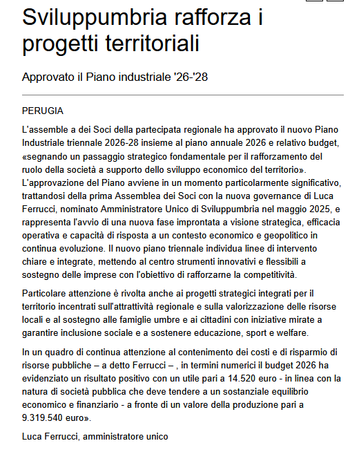 L’approvazione del Piano avviene in un momento particolarmente significativo, trattandosi della prima Assemblea dei Soci con la nuova governance di Luca Ferrucci, nominato Amministratore Unico di Sviluppumbria nel maggio 2025, e rappresenta l’avvio di una nuova fase improntata a visione strategica, efficacia operativa e capacità di risposta a un contesto economico e geopolitico in continua evoluzione.