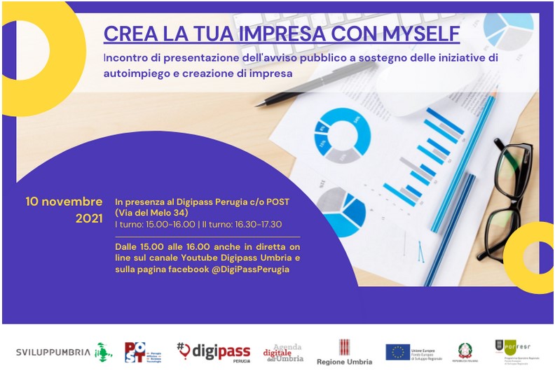 Il Digipass + Hub di Perugia, in collaborazione con il POST Museo della Scienza di Perugia e Sviluppumbria SpA – Agenzia per lo Sviluppo Economico della Regione Umbria, vi invitano alla presentazione del bando MYSELF a sostegno delle iniziative di autoimpiego e creazione di impresa.