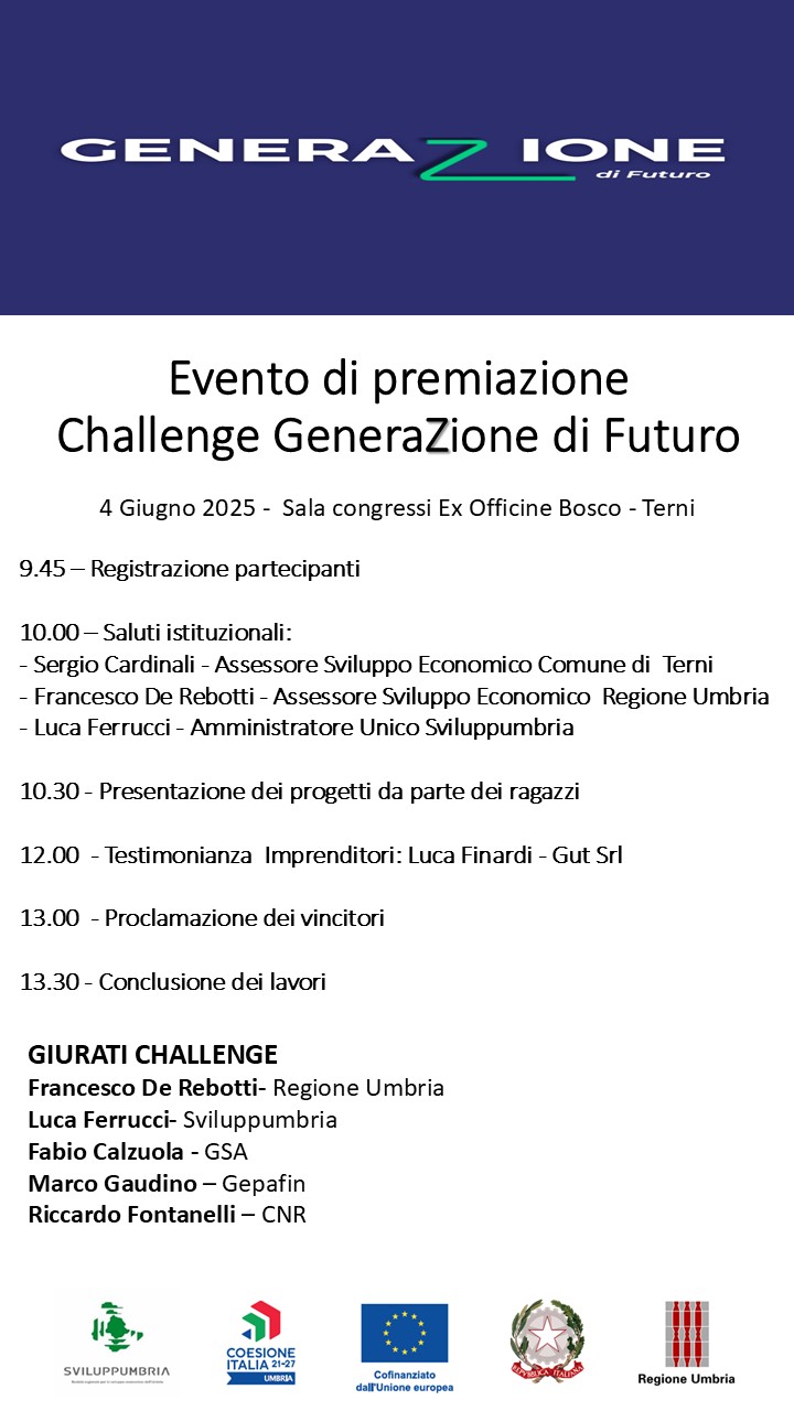 Regione Umbria e Sviluppumbria, in collaborazione con GSA (Società di servizi e comunicazione del gruppo GESENU), l’Accademia Pratica dell’Innovazione della Regione Umbria e con il supporto di JA Italia (Junior Achievement - organizzazione non profit dedicata all’educazione economico imprenditoriale dei giovani presenta la terza edizione della challenge dedicata agli studenti delle III e IV classi delle scuole secondarie di secondo grado della Regione Umbria. La Challenge, dal titolo” GENERAZIONE DI FUTURO”, si inserisce nelle iniziative promosse dall’Assessorato allo Sviluppo economico della Regione Umbria con l’obiettivo di sperimentare, motivare e sviluppare la capacità di innovazione e di pensiero critico delle giovani generazioni, promuovendo tra gli studenti lo sviluppo di una mentalità imprenditoriale.