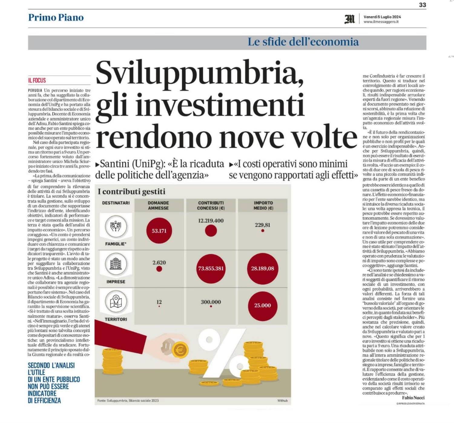 Focus sul Bilancio sociale. Il “Bilancio Sociale e Relazione di sostenibilità 2023”, il terzo per Sviluppumbria, dà atto del raggiungimento degli obiettivi nell'ambito della trasparenza e dell'efficacia voluti dalla Giunta regionale; è stata condotta una valutazione presso gli utenti dell'impatto che l'azione di Sviluppumbria ha generato nei loro confronti misurando in modo tangibile il valore aggiunto verso imprese, famiglie e territori. Un feedback nei confronti della Società molto positivo, tanto è vero che circa il 90% degli imprenditori intervistati valuta in maniera estremamente efficace sia la quantità dei servizi erogati, sia la qualità dell’assistenza ricevuta in termini di professionalità, disponibilità e cortesia, da parte degli uffici di Sviluppumbria.